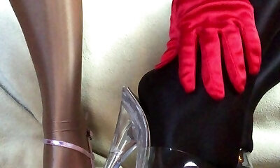Sensual taunting close up legs and feet in Shiny glossy pantyhose and high heels.