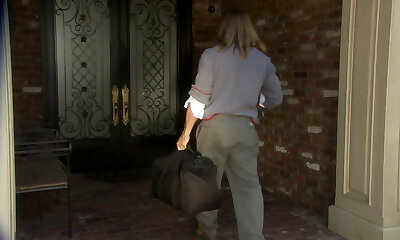 A beautiful blonde housewife jumps out of her shorts and grounds on a cock