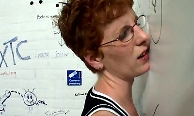 Gross four eyed woman sucks the dick through the gloryhole