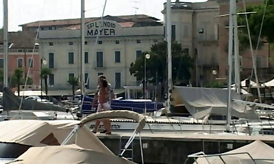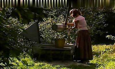 A sexy German lady getting her boobs sprayed outdoors